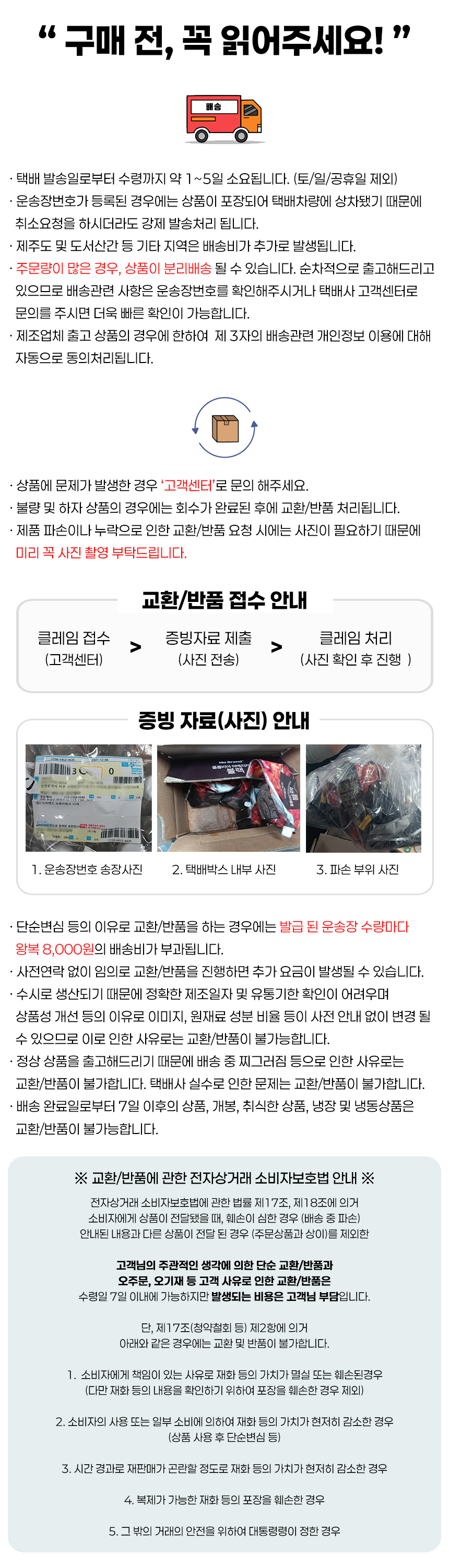 | 반품/교환 불가능 사유 | 전자상거래 소비자보호법에 관한 법률 제17조, 제18조에 의거 소비자에게 상품이 전달됐을 때, 훼손이 심한 경우 (배송 중 파손), 안내된 내용과 다른 상품이 전달 된 경우 (주문상품과 상이)를 제외한 고객님의 주관적인 생각에 의한 단순 교환/반품과 오주문, 오기재 등 고객 사유로 인한 교환/반품은 수령일 7일 이내에 가능하지만 발생되는 비용은 고객님 부담입니다. 단, 제17조(청약철회 등) 제2항에 의거 아래와 같은 경우에는 교환 및 반품이 불가합니다. 1. 소비자에게 책임이 있는 사유로 재화 등의 가치가 멸실 또는 훼손된경우 (다만 재화 등의 내용을 확인하기 위하여 포장을 훼손한 경우 제외) 2. 소비자의 사용 또는 일부 소비에 의하여 재화 등의 가치가 현저히 감소한 경우 (상품 사용 후 단순변심 등) 3. 시간 경과로 재판매가 곤란할 정도로 재화 등의 가치가 현저히 감소한 경우 4. 복제가 가능한 재화 등의 포장을 훼손한 경우 5. 그 밖의 거래의 안전을 위하여 대통령령이 정한 경우 | ||
